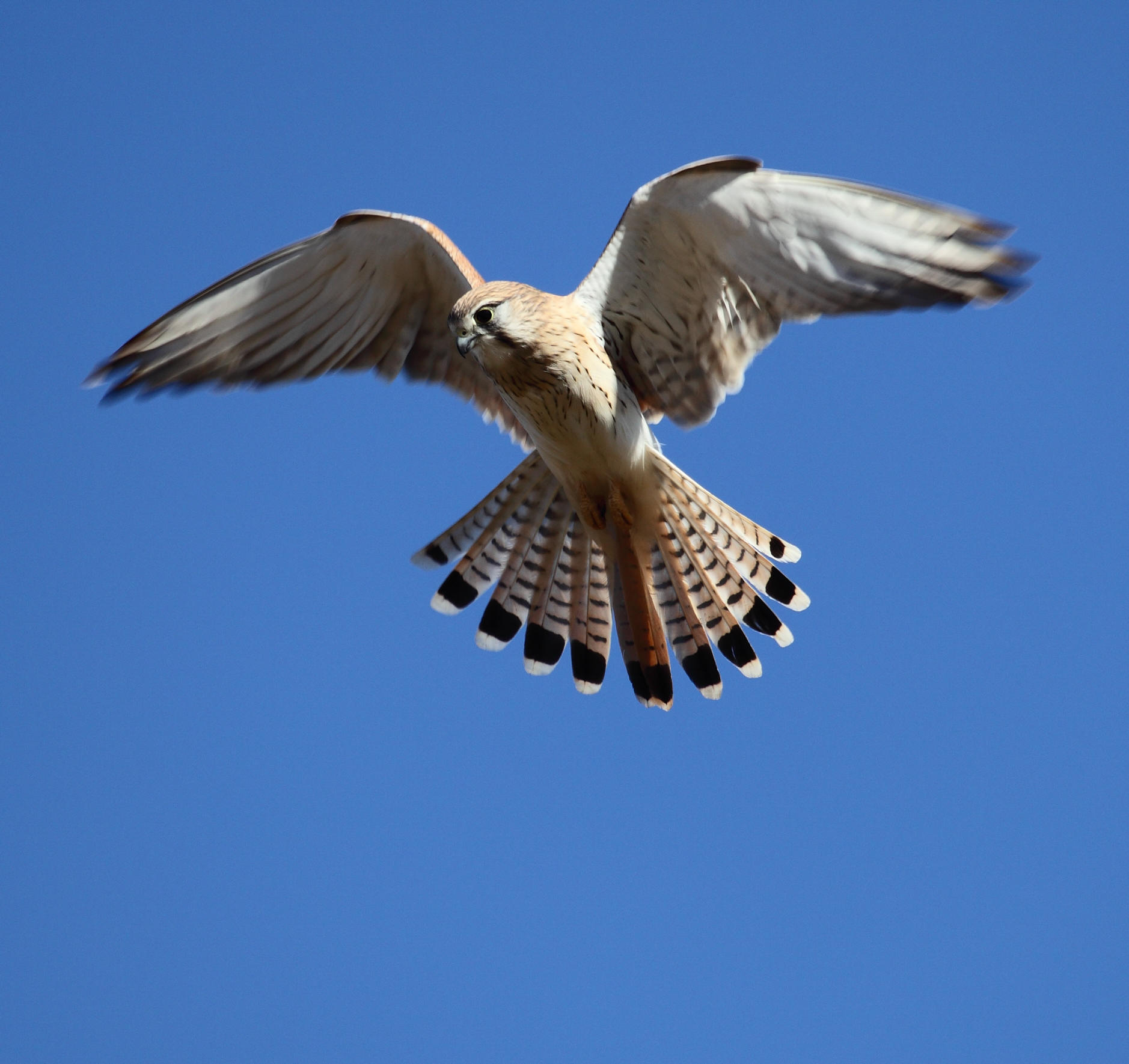 This bird is unmistakeable when it is seen hovering like this over an open field. The broad, black band across the bottom of the tail distinguishes it from any other bird of prey around Alice. In a stiff breeze, the kestrel can remain almost motionless as those powerful eyes scour the ground for any tiny movement that could be a mouse scurrying under a bush.