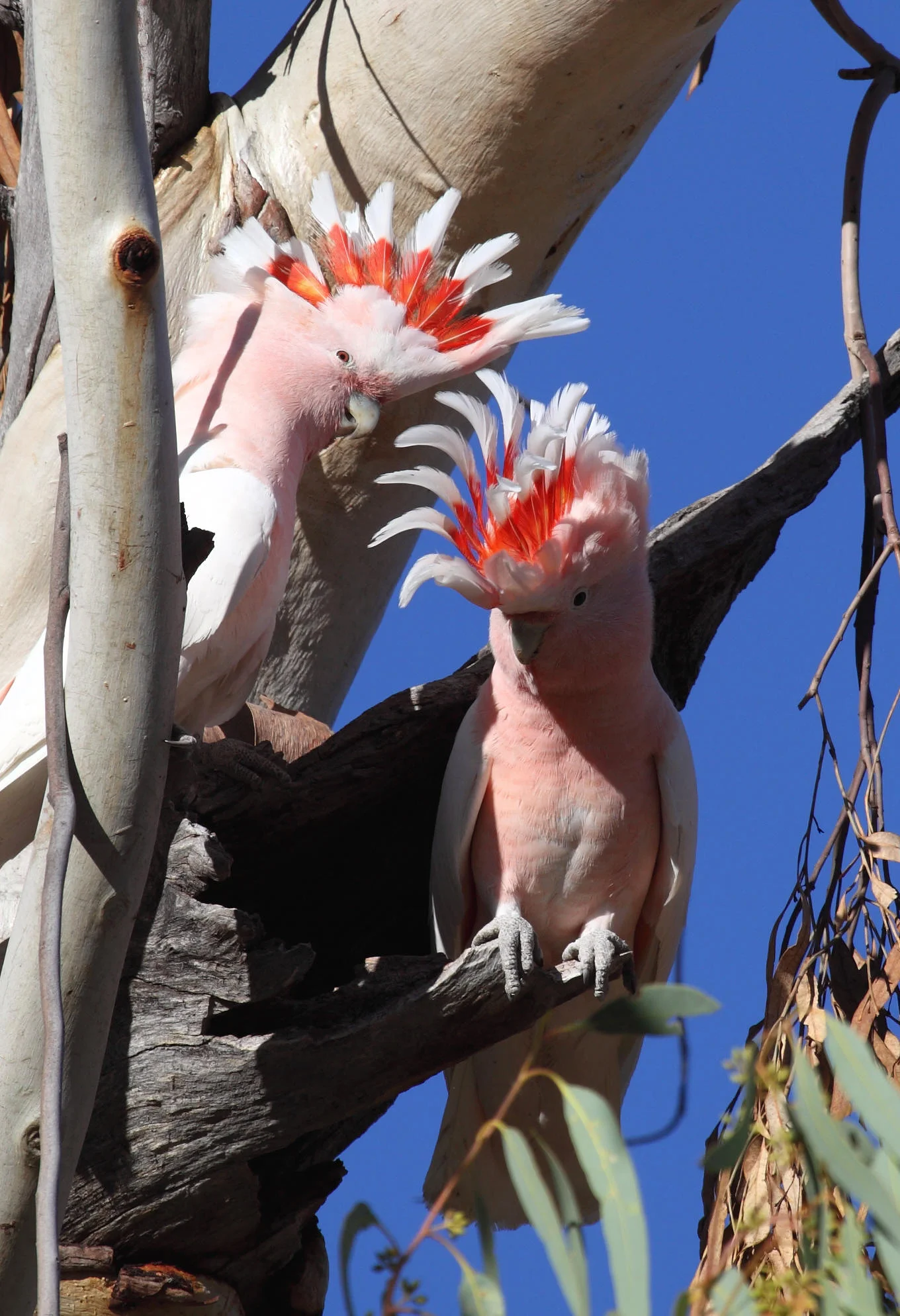 Major Sir Thomas Mitchell, an explorer of the 1830s and 1840s, once wrote of the cockatoos that are named for him; “few birds more enliven the monotonous hues of the Australian forest than this beautiful species whose pink-coloured wings and flowing crest might have embellished the air of a more voluptuous region”. While I might disagree with his aspersions of “monotonous hues” in the Australian bush, and have no idea what a “more voluptuous region” might mean, I otherwise agree with his sentiments. The Pink Cockatoo is certainly one of the more exciting and eye-catching birds that we’re lucky enough to find locally.