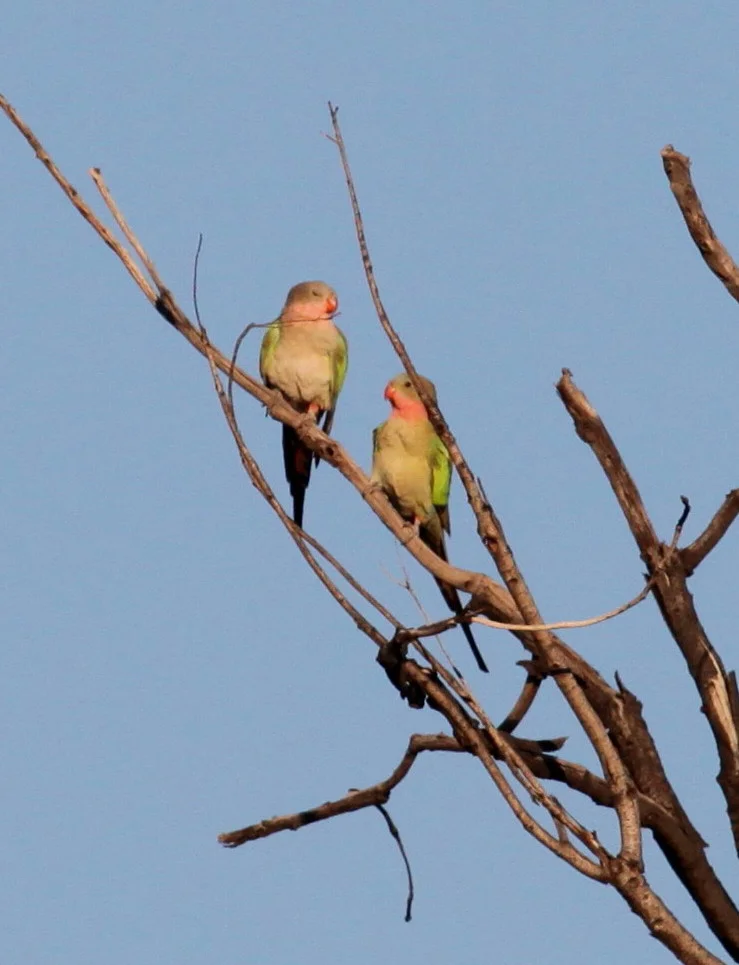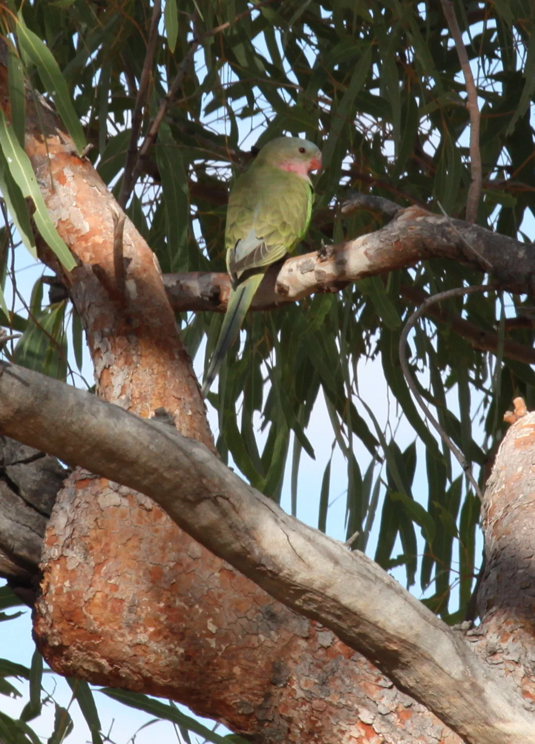 So when it is at home, the Princess Parrot’s lime green shoulders vanish into the fresh growth on a Desert Bloodwood. The powdery pinks and sky blues are by turns shaded and brightened in flight by the reflected hues of earth and sky. And then there’s the thing you’ll never get from a caged bird: the jizz. That ineffable but distinctive movement and posture that is unique to a species. Like its congeners this is a high-speed mover. When the deserts dry and the water holes are distantly separated, the birds are capable of covering the necessary distance in short order. Counter-intuitively for a bird with such a long tail, it has the strange habit of perching along a branch. Not always. I’m sure you’ll find plenty of pictures of them perching in the conventional fashion with their elongated rectrices spearing earthward at a right angle to the branch, but they are often observed with those feathers laid flat along the length of the branch – almost frogmouth-like. Perhaps another concession to crypsis? Maybe all the Polytelis parrots do this, I’m not sure. I’ve seen Regent Parrots do it, but I’ve never seen Superb Parrots.